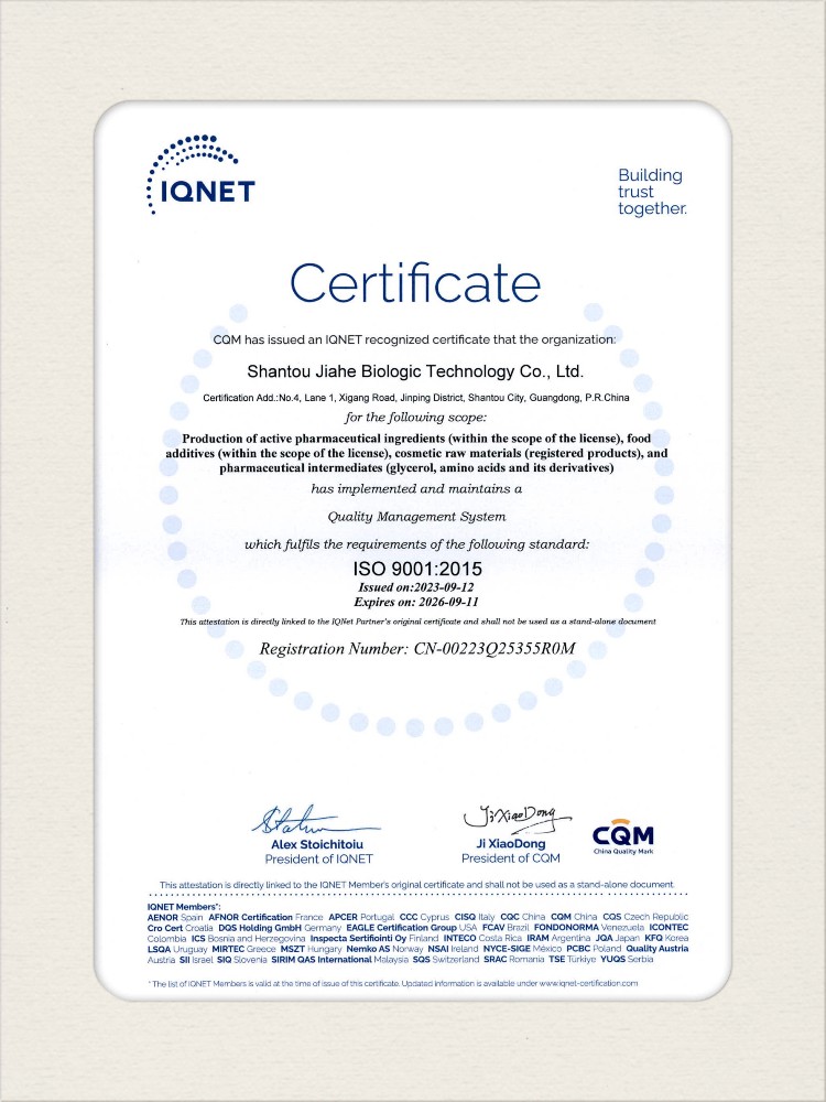 汕頭佳禾生物科技有限公司是一家致力于氨基酸及其衍生物研發(fā)、生產(chǎn)和銷售的國家高新技術(shù)企業(yè),先后通過了國家藥品GMP認(rèn)證,ISO9001質(zhì)量體系認(rèn)證、ISO14001環(huán)境管理體系認(rèn)證。目前,公司擁有“廣東省專精特新中小企業(yè)”、“廣東省氨基酸產(chǎn)品工程技術(shù)研究中心”、“汕頭市生物發(fā)酵工程技術(shù)研究開發(fā)中心”、“汕頭市知識(shí)產(chǎn)權(quán)優(yōu)勢企業(yè)”、“多項(xiàng)國家發(fā)明專利”、“廣東省守合同重信用企業(yè)”等多項(xiàng)資質(zhì)和榮譽(yù),旗下“佳禾牌”系列產(chǎn)品已成為原料藥行業(yè)知名品牌。 新泰市佳禾生物科技有限公司成立于2012年8月,注冊資金2億元,公司位于山東泰安新泰市新汶工業(yè)園區(qū),是國 家級高新技術(shù)企業(yè)、山東省“專精特新”企業(yè)、山東省制造業(yè)單項(xiàng)冠軍企業(yè)、泰安市科技型中小企業(yè)、泰安市農(nóng)業(yè)產(chǎn)業(yè)化龍頭企業(yè)、中國生物發(fā)酵產(chǎn)業(yè)協(xié)會(huì)理事單位。